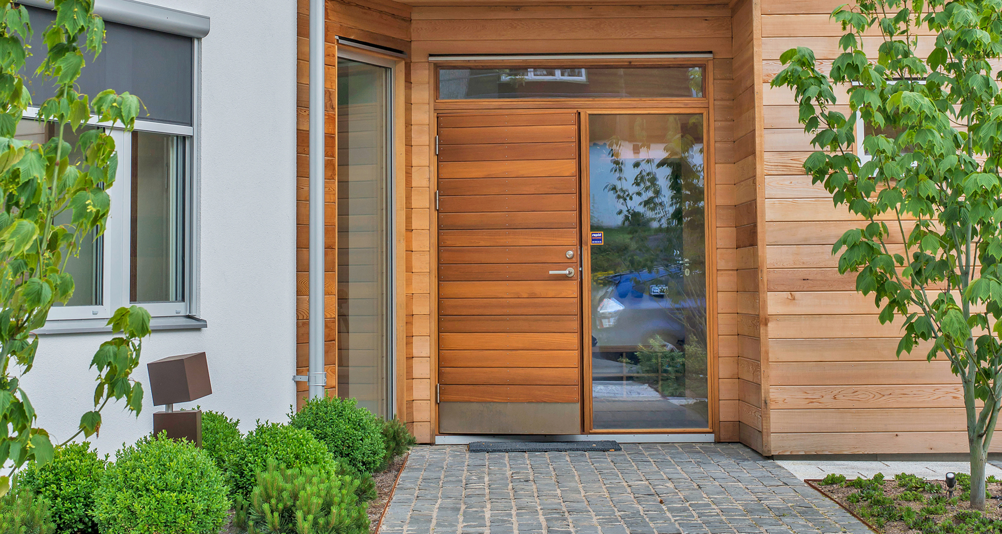 Våra ytterdörrar med sidoljus är byggda med respekt för råvaran. Träets struktur innehåller unika avtryck från naturen och varje trästycke, panel, karm, tröskel och list är som små stycken konst i sig.